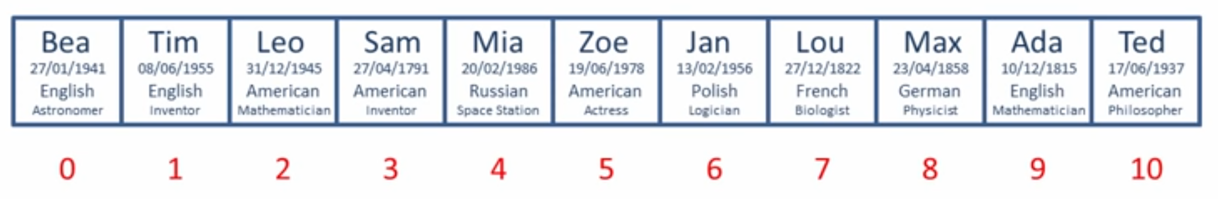 위 배열에서는 기존에 있던 사람의 이름(key) 뿐만 아니라 생년월일, 국적, 직업과 같은 부속 데이터(satellite data)가 함께 있는 것을 확인할 수 있다. 즉, 해시 테이블은 (이 예제에서는) 이름을 키(key)로 활용해 상수 시간(Constant time) 안에 인덱싱하고 필요하다면 부속 데이터에도 접근하는 자료구조다.