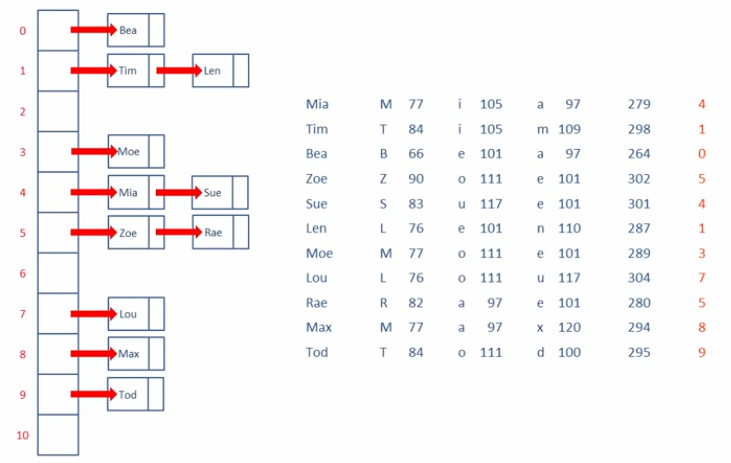 보통 0번째 배열부터 찾고자 하는 문자열을 발견할 때까지 비교해나가는 방법으로 프로그램을 만든다. 이 예와 같이 원소의 수가 11개인 경우에는 빠르게 할 수 있지만 원소의 수가 커질수록 이 프로그램의 탐색 속도는 느려진다(O(n)이기 때문). 하지만 찾고자 하는 Ada라는 문자열 자체에서 인덱스인 8을 추론할 수 있다면, 원소가 얼마나 많든 탐색 하는데 O(1)의 시간만 있으면 된다.(각 char의 ASCII 코드를 더한 값을 배열의 크기로 나눈 나머지 값을 인덱스로 사용하였다)