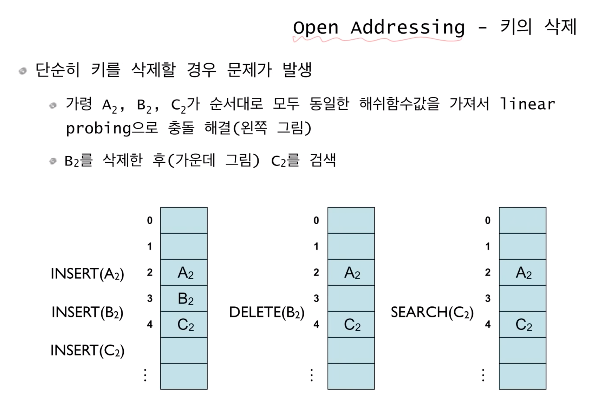 선형 탐색으로 탐색했을 때의 예시다. 만약 A2, B2, C2의 해시 값이 모두 2라면, 왼쪽 그림과 같이 2, 3, 4번에 위치하게 된다. 중간 그림처럼 B2를 삭제했다고 하자. 그리고 오른쪽 그림처럼 C2를 찾을 때, 먼저 2번과 비교해 값이 다르므로 3번을 보는데, 이때 값이 없으므로 C2가 없다고 판단하게 된다. C2는 테이블에 있으므로 이것은 사실이 아니다. 이것이 개방 주소화 방법의 문제점이다.